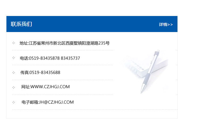 地址:常州市新北區友邦商務大廈1幢16、17層  電話:0519-85101652  傳真:0519-85112595  郵編:213022  網址:www.cz-jiayue_cn.sdwejx.com  郵箱:xiajifengaa@163.com